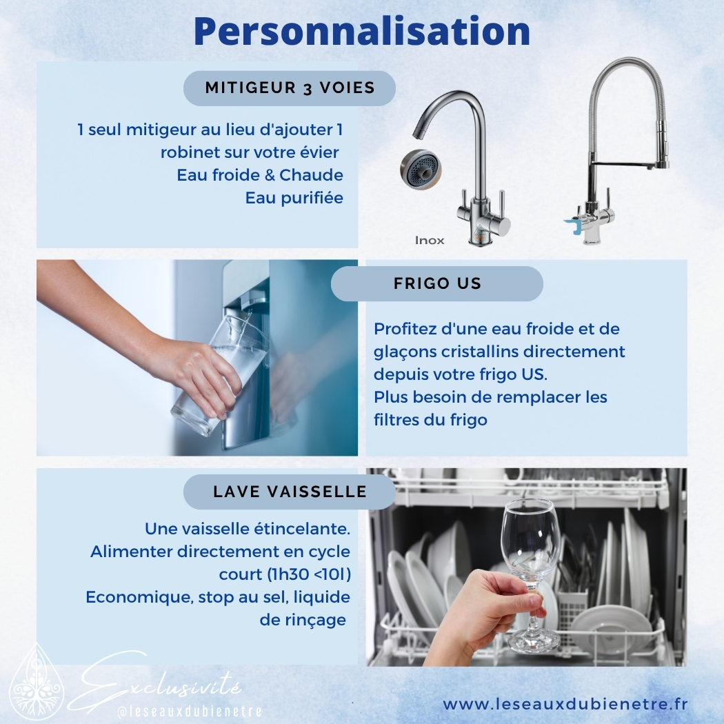 - Distribution : choix de remplacer votre vieux mitigeur par un tout beau et pratique mitigeur 3 voies, avec l'eau purifiée en plus de l'eau froide et chaude